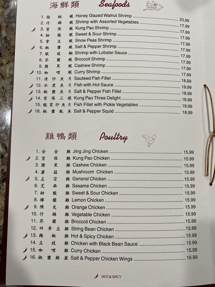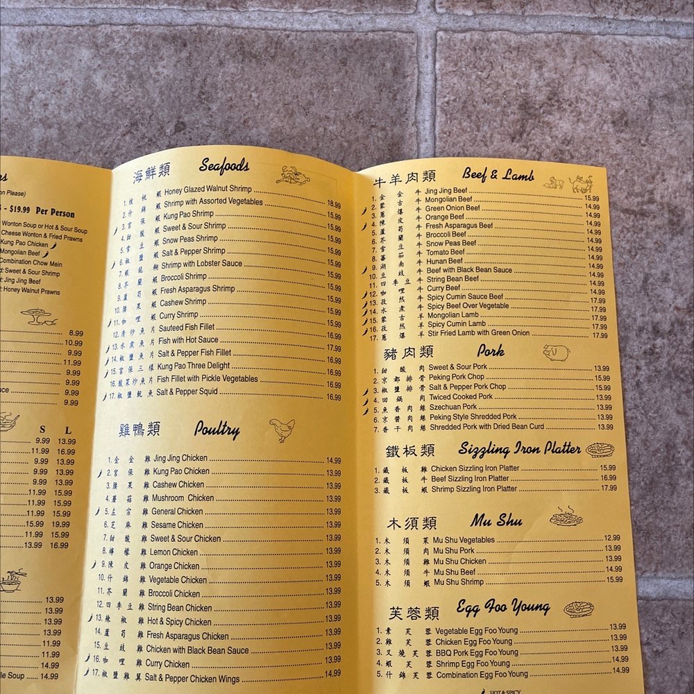 Wonton soup or hot and sour soup, cheese wonton and fried prawns, kung pao chicken (hot and spicy), Mongolian beef (hot and spicy), combination chow mein, sweet and sour shrimp, jing jing beef and honey walnut prawns.