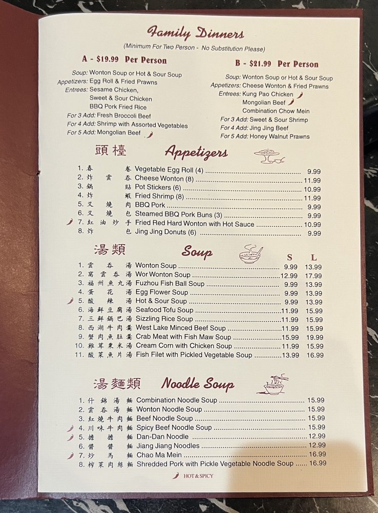 Wonton soup or hot and sour soup, cheese wonton and fried prawns, kung pao chicken (hot and spicy), Mongolian beef (hot and spicy) and combination chow mein.